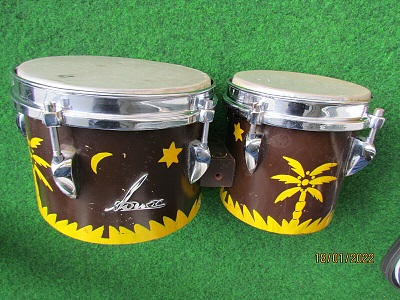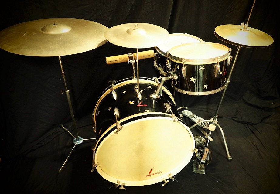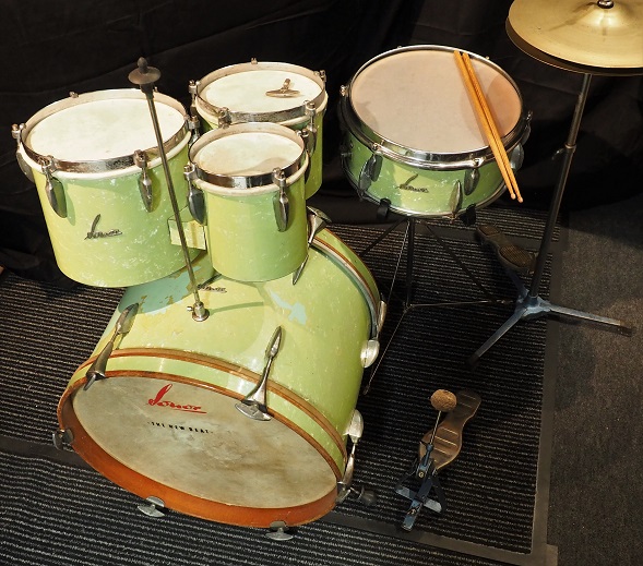 Konfiguration: 13"Tom,16"Stand,20"Bass, Pancake-Snare, the New Beat Hardware, Presto Fusspedal. Bis auf einige gewechselte Felle und den zusätzlichen Bongos aus den 60´s alles original erhalten. Die Cymbals sind von Zanchi F+F.