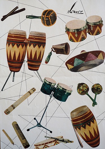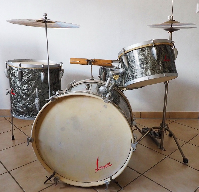 Konfiguration: 13"Tom,16"Stand,20"Bass, Pancake-Snare, the New Beat Hardware, Presto Fusspedal. Bis auf einige gewechselte Felle und den zusätzlichen Bongos aus den 60´s alles original erhalten. Die Cymbals sind von Zanchi F+F.